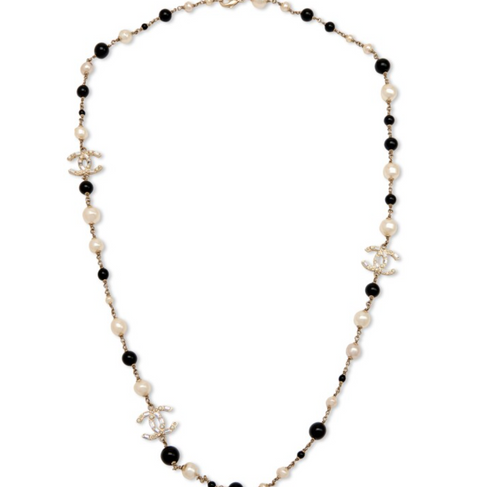 ARKET Off-Shoulder Mini Dress- £39.60, Miss Rosier- Solène white pointed-collar shirt - £91.00, Chanel Necklace, £1600 Sothebys, MINT VELVET - Black Ribbed Bardot Top £79